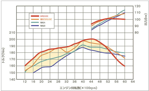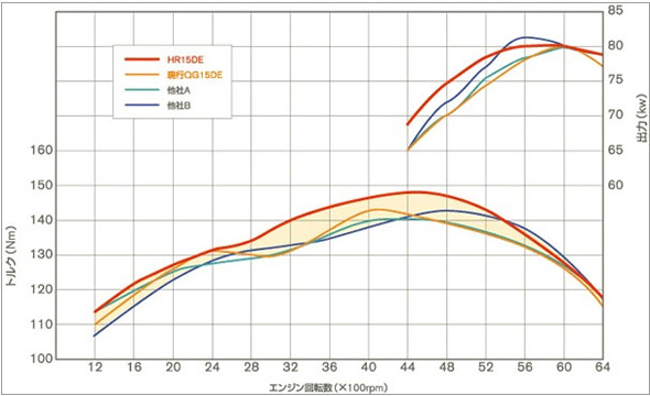 與CVT組合達(dá)到在實(shí)際世界中的暢快駕駛與低油耗的同時(shí)實(shí)現(xiàn),實(shí)現(xiàn)了從低速扭矩(強(qiáng)勁的動(dòng)力)和向中高速扭矩的延伸。