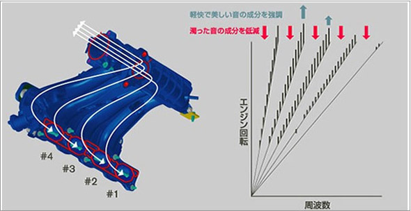 通過將進(jìn)氣歧管的4根支管的音響長(zhǎng)度設(shè)置為相同,實(shí)現(xiàn)了強(qiáng)調(diào)輕快美妙的"基本次數(shù)成分",大幅度減少相當(dāng)于" 濁音"的"半音次數(shù)成分"。另外隨著發(fā)動(dòng)機(jī)轉(zhuǎn)動(dòng)速度加快,音韻也隨之提高,可讓人心情愉悅。