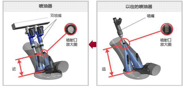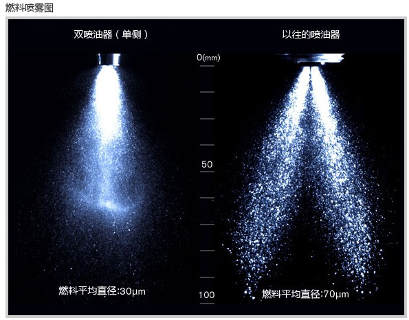 通常汽油發(fā)動(dòng)機(jī)的每一個(gè)氣缸配置一個(gè)噴油器,向兩個(gè)進(jìn)氣口(吸氣口)噴射燃料,而此系統(tǒng)則是世界上首次*1分別在每個(gè)進(jìn)氣口配置一個(gè)噴油器、每個(gè)氣缸配置兩個(gè)噴油器的構(gòu)造。與以往相比,噴出的霧狀燃料顆粒的直徑縮小約60%,因此極大地提高了燃燒的穩(wěn)定性。