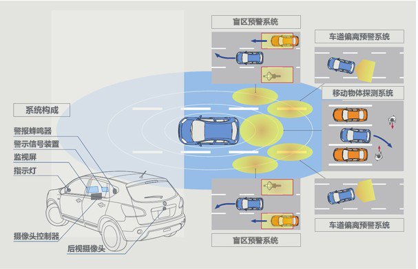帶有后視攝像頭的多元感應(yīng)系統(tǒng),采用了日產(chǎn)汽車引以為豪的全景式影像監(jiān)控系統(tǒng)的圖像解析技術(shù)。一個(gè)攝像頭可以將車體側(cè)面、后面的各種風(fēng)險(xiǎn)盡收眼底。比如,如果感知到相鄰車道的車從后方駛來,"盲區(qū)預(yù)警系統(tǒng)"則提示注意;如果行駛過程中偏離車道,"車道偏離預(yù)警系統(tǒng)"則發(fā)出警報(bào);如果車體后方有正在移動(dòng)的人或物體,則"移動(dòng)物體探測(cè)系統(tǒng)"自動(dòng)啟動(dòng)。警示信號(hào)或聲音會(huì)隨時(shí)提醒駕駛者注意已經(jīng)出現(xiàn)的風(fēng)險(xiǎn),因此駕駛者可以放心地專心駕駛。帶有后視攝像頭的多元感應(yīng)系統(tǒng),以簡單的系統(tǒng)構(gòu)成實(shí)現(xiàn)了多重功能,旨在為更多的駕駛者提供無憂駕駛體驗(yàn)。為實(shí)現(xiàn)"零事故"的汽車社會(huì),日產(chǎn)汽車一直不懈努力。