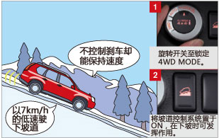 在較滑的下坡路上行駛時(shí),通過坡道控制系統(tǒng)可自動控制車速,讓駕駛員在低速狀態(tài)中放心地駛下坡道。