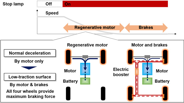 松開加速踏板會(huì)觸發(fā)電動(dòng)機(jī)啟動(dòng)車輛減速過程。當(dāng)車輛完全停止時(shí),會(huì)自動(dòng)應(yīng)用剎車。另外,在低附著力路面行駛時(shí),剎車也會(huì)同步啟動(dòng),利用四個(gè)車輪安全地使車輛減速。